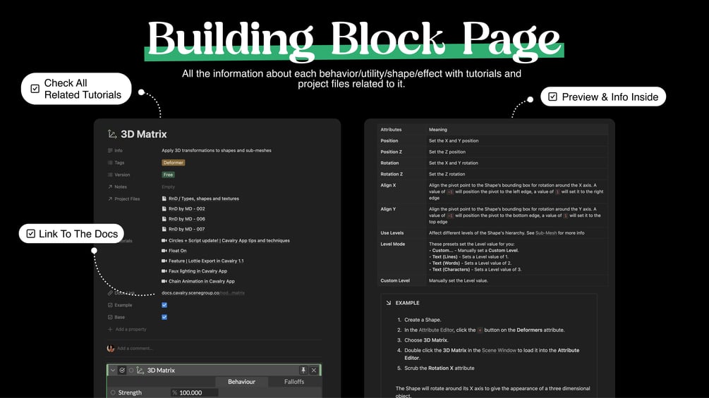 - Project Files - selected project files for you to study, sorted by different authors, sources, utilities, etc. (Important! Actual project files are removed from the template to respect copyrights, but there is a link for each one where you can download it for free, you can also upload it into the database if you want. The exception is the tutorial files from the official cavalry YouTube channel which I’ve recreated following instructions)