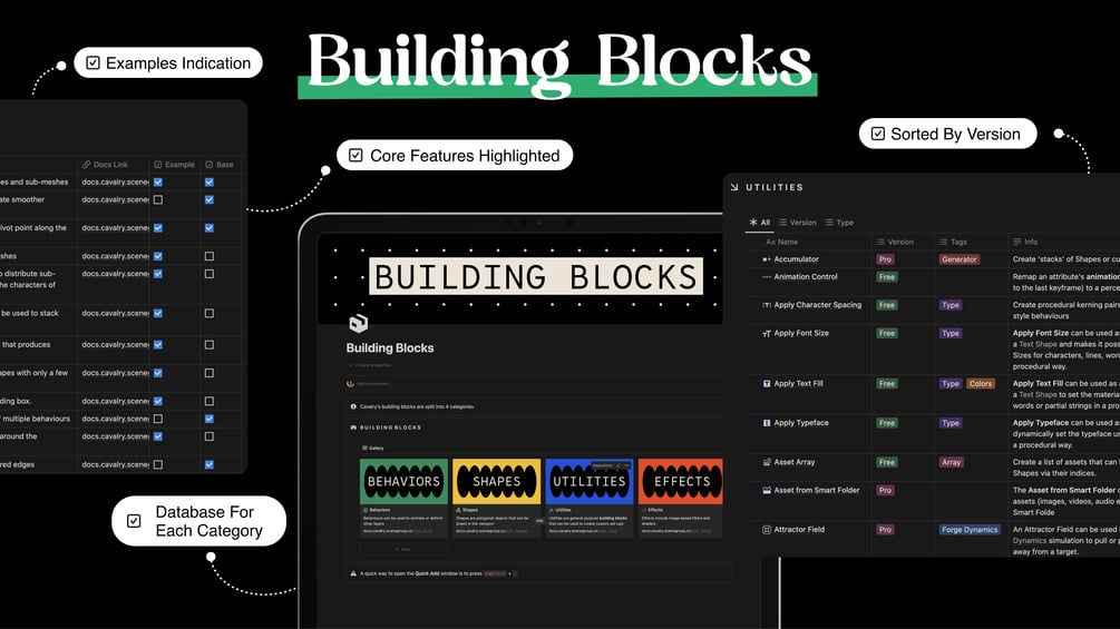 - Building blocks - information on each behavior/utility/shape/effect with all the related tutorials, project files, and notes. There is also an indication if you can find an example tutorial inside for each particular behavior.