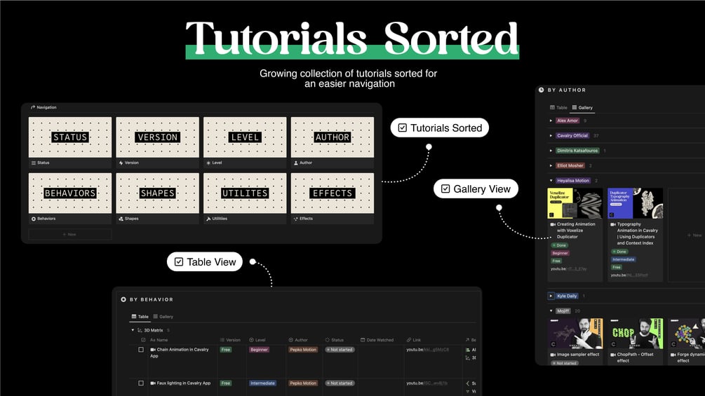 - Project Files - selected project files for you to study, sorted by different authors, sources, utilities, etc. (Important! Actual project files are removed from the template to respect copyrights, but there is a link for each one where you can download it for free, you can also upload it into the database if you want. The exception is the tutorial files from the official cavalry YouTube channel which I’ve recreated following instructions)